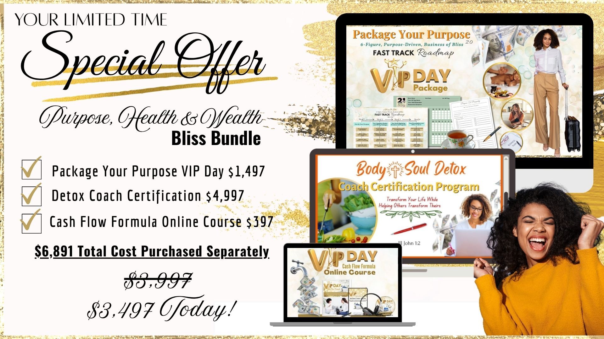 The "Purpose, Health & Wealth Bliss Bundle" is comprised of 3 life-transforming programs. The "Package Your Purpose" VIP Day is a full day with me where I'll take you through the process of clarifying your purpose, branding your brilliance, and laying out a plan for an income-producing purpose-driven business. The offer is priced for the Virtual VIP Day on Zoom however you're welcome to upgrade to the In-person SI, NY Package (at my home) or the 2-Day Retreat Package in Atlantic City at an additional cost.